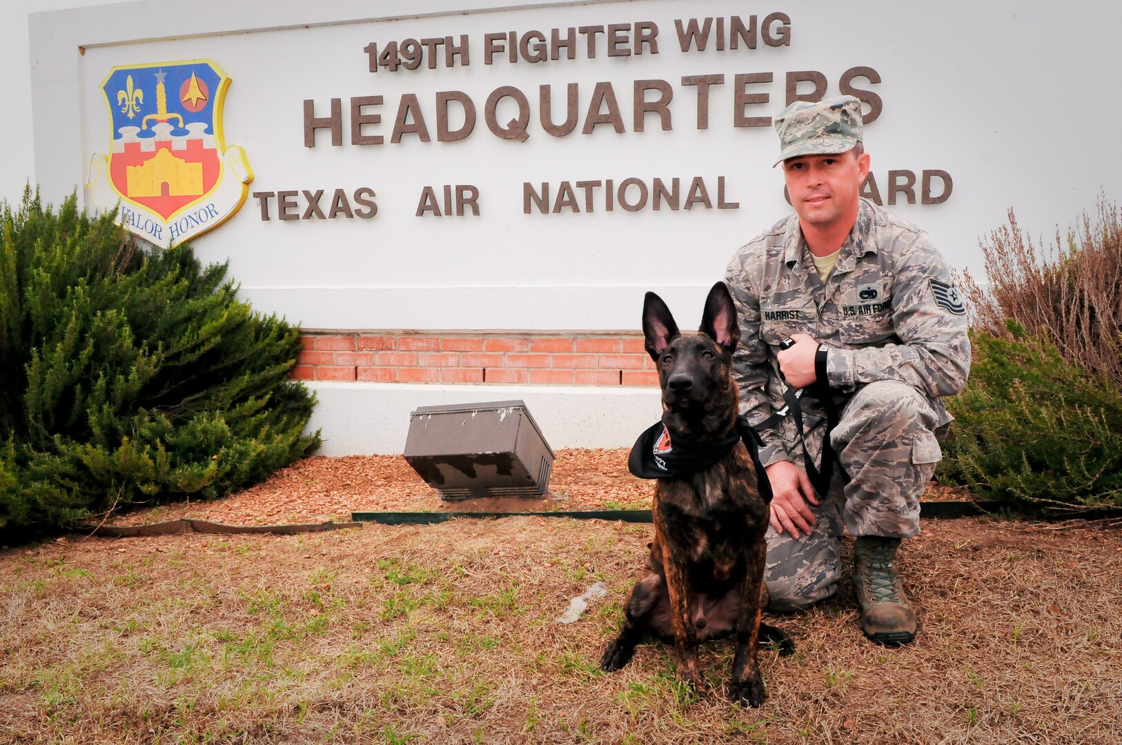 Col. Susan M. Dickens, commander of the 149th Mission Support Group, and Tech. Sgt. Brandon M. Harrist, an aircraft electrical and environmental systems craftsman assigned to the 149th Maintenance Squadron, are each fostering military working dogs in training.