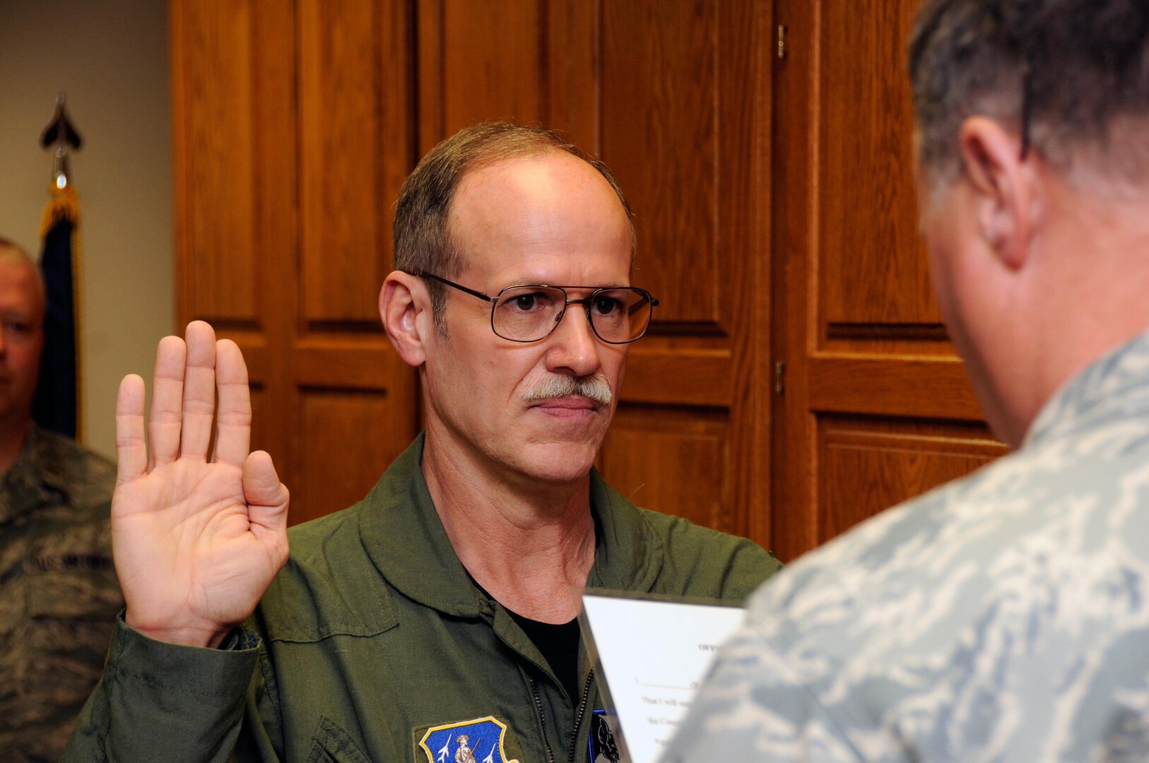 Maj. (Dr.) Glenn Harden entered military service for the first time at age 56. His swearing-in ceremony took place with members of his family present here at the 185th Air Refueling Wing on May 1.