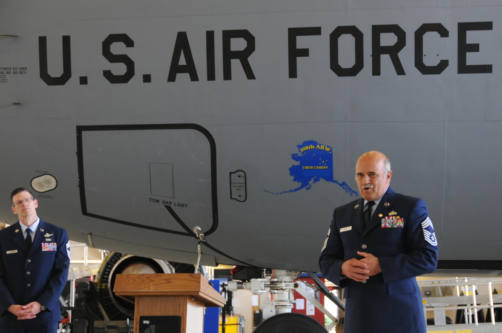 "You and I have had a lot of hours in this plane together," said Col. Bryan White, operations group commander, referring to the KC-135 parked as a backdrop for the ceremony. "You've made this a much better organization, and we have people downrange in the fight right now flying the Alaska flag over hostile territory, and they are there as the best prepared, best qualified people in the business thanks to the legacy of people like you," said White.