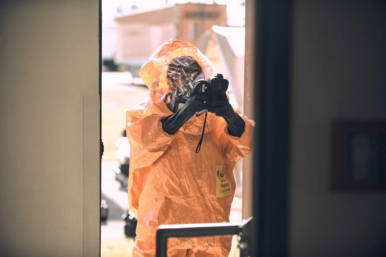 Once on-site, the team sets up a decontamination area to treat any injured or contaminated people or equipment. A two-person survey team in HAZMAT suits with breathing equipment then enters the building. They check every room for levels of hazardous materials and photograph every room, physically marking each room as they go.