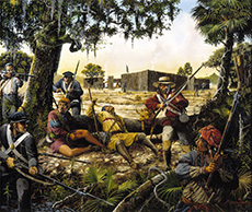 In 1821, when Florida became part of the U.S., it was home to about 5,000 Seminole Indians. In 1823 the Seminoles were persuaded to move to a reservation, but by 1830 the U.S. government had made plans to remove the entire tribe to Arkansas. The "non-removers," led by a chief the Whites called Osceola, vowed to resist. In November 1835 the senior Army commander in Florida accepted 500 Florida mounted militia into Federal service, and Regular troops they immediately began patrolling isolated plantations. This mission took on a new urgency after December 28, when the Seminoles under Osceola ambushed and massacred a column of U.S. troops. Only three soldiers survived out of 108. When officials called for more troops, South Carolina, Louisiana, Alabama, and Georgia responded immediately. Part of Georgia's quota of 3,500 for Federal service were the Macon Volunteers. In February of 1836, as part of the 1st Battalion, Georgia Volunteers, the Macon company departed for Picolata, west of St. Augustine, where they were sworn into active Federal service for 90 days. Major General Winfield Scott, just arrived to assume command, sent the 321 Georgians, along with 720 regulars and almost 1,000 Louisiana militia, to the edge of the Withlacoochee Swamp. After several skirmishes and a river crossing under fire, the number of wounded and sick began to multiply. General Scott ordered them left behind under the care of the Georgia Battalion assisted by a few artillerymen with a six-pound gun. Under constant attack from the Seminoles (one party of 50 Georgians held off more than 200 Indians), the men began building a log fort named after their commander, Major Mark Anthony Cooper. As they alternated between work parties, patrolling, and guarding the hastily-constructed log stockade, rations and ammunition began to run low. On April 17, the Georgia Battalion was relieved by General Scott's men. They marched back to Picolata, were mustered out of Federal service, and by mid-May had sailed back to Georgia. The Seminole War continued for another six years. The Macon Volunteers continue today in the Georgia Army National Guard as Headquarters and Headquarters Company, 48th Infantry Brigade.