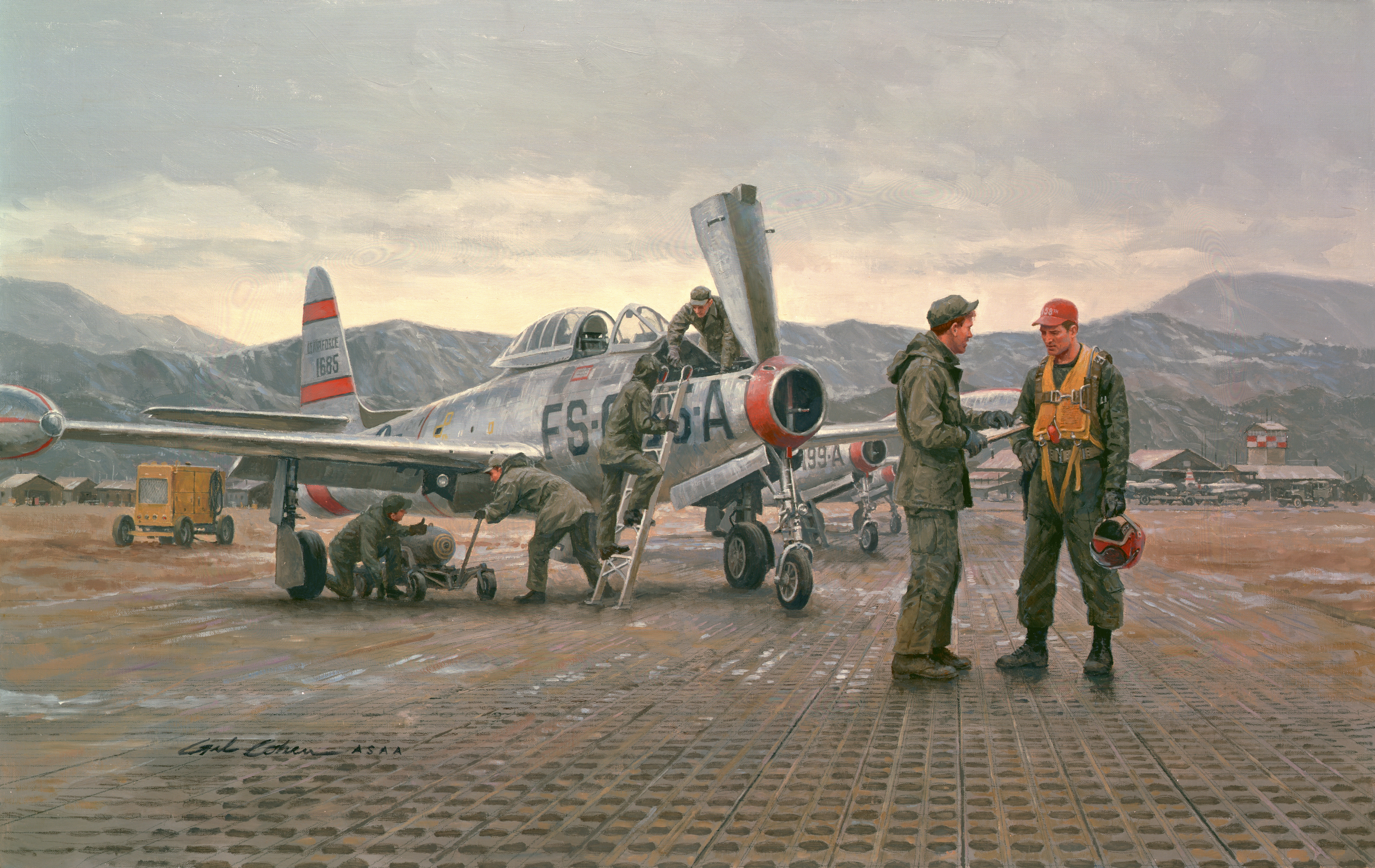 The 158th Fighter Bomber Squadron (FBS) of the Georgia Air National Guard (ANG) was mobilized in October 1950. After converting from F-80Cs to F-84Es, the unit moved to Japan in July 1951. It was one of six mobilized Air Guard fighter squadrons that saw combat in the Far East during the Korean War. Stationed at Misawa Air Base, the 158th deployed for short periods of time to the austere forward operating location at Taegu Air Base in the Republic of Korea where it concentrated on flying dangerous ground attack missions against enemy supply lines and troops in the field. Starting in February 1952, the 158th also participated in Operation High Tide, an experimental combat air-refueling project conducted by the Air Force. In July 1952, the unit left federal service and returned to state control after completing its required 21 months of active duty. In addition to the 158th, the other Air Guard fighter units that flew combat missions in Korea included: the 111th FBS, Texas; 154th FBS, Arkansas; 159th FBS Florida; 182nd FBS, Texas; and 196th California. Pilots assigned to the six fighter Air Guard units plus ANG aviators serving in regular Air Force squadrons flew 39, 530 combat sorties in Korea. They destroyed 39 enemy aircraft and four of them became aerial aces. However, the cost was high with 101 Air Guardsmen either killed or declared missing in action. Korea was the Air Guard's first and largest war as a reserve component of the Air Force. Over 45,000 Air Guardsmen, 80 percent of the force, were called into federal service. Altogether, 67 of the Air Guard's 84 combat flying squadrons were mobilized. Those ANG flying units not deployed to Korea were either dispatched to buildup NATO in Europe or assigned to major air commands in the United States to strengthen the Air Force for a possible global military confrontation with the Soviet Union. During the Korean War period, mobilized Air Guard units operated a wide variety of aircraft including F-47s, F-51s, B-26s, B-29s, RB-29s, RB-36s, B-45s, F-80s, F-84s, and F-86s.