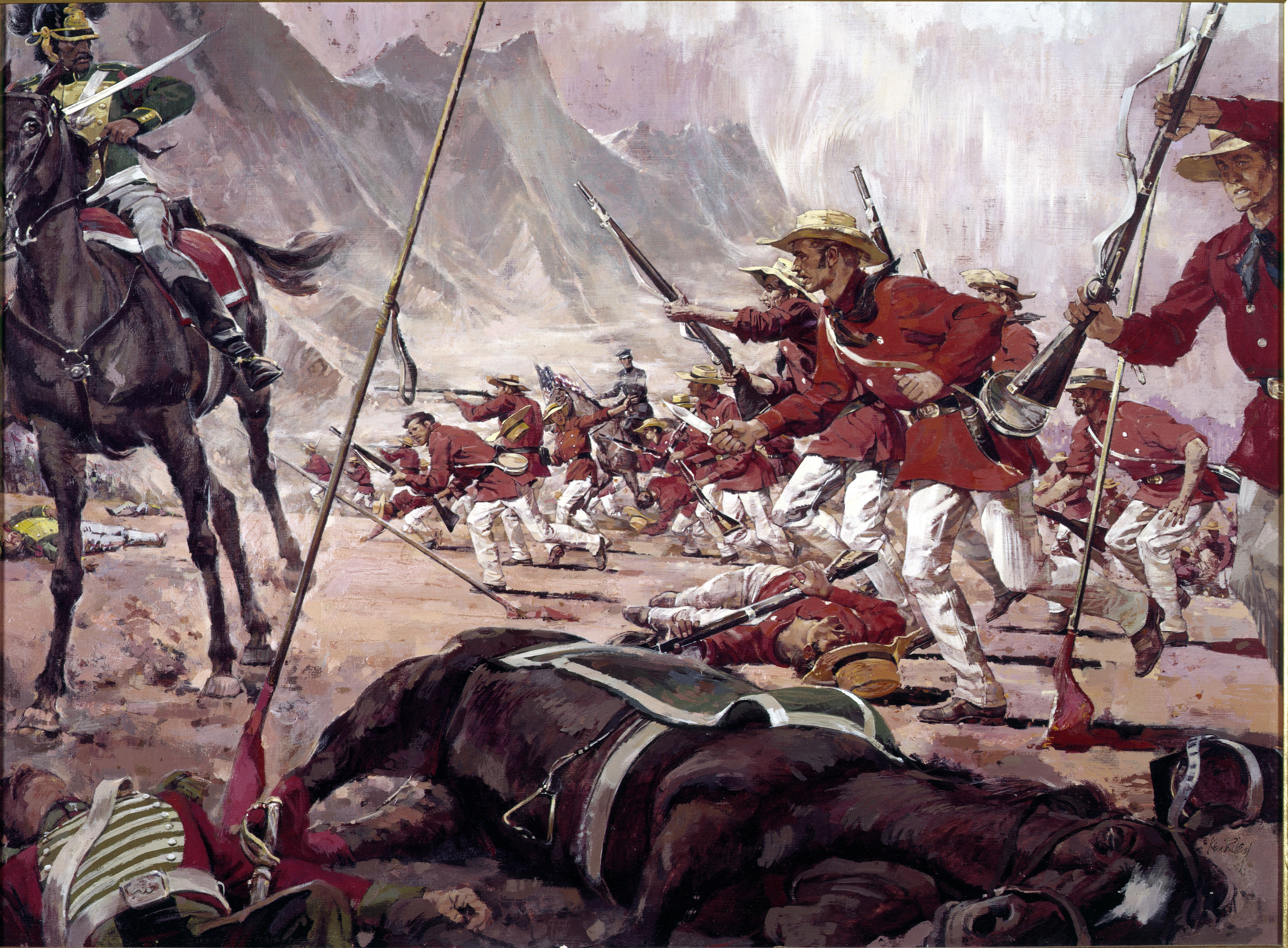 Fighting in the open on a dusty mountainside in a foreign land a thousand miles from home, facing an enemy many times its own strength, the Mississippi Rifles displayed a rock-like defense against a Mexican attack in response to the command, "Stand Fast, Mississippians!" Earlier, the battle had reached a critical stage when the Rifles (in the action depicted) were ordered to attack Mexican cavalry and infantry advancing on the Americans. The "hard-fighting Mississippi gentlemen" moved up, fired, then drew Bowie knives and closed in. The Rifles--the 155th Infantry of the modern Mississippi Army National Guard--thus wrote another chapter in the proud National Guard tradition.