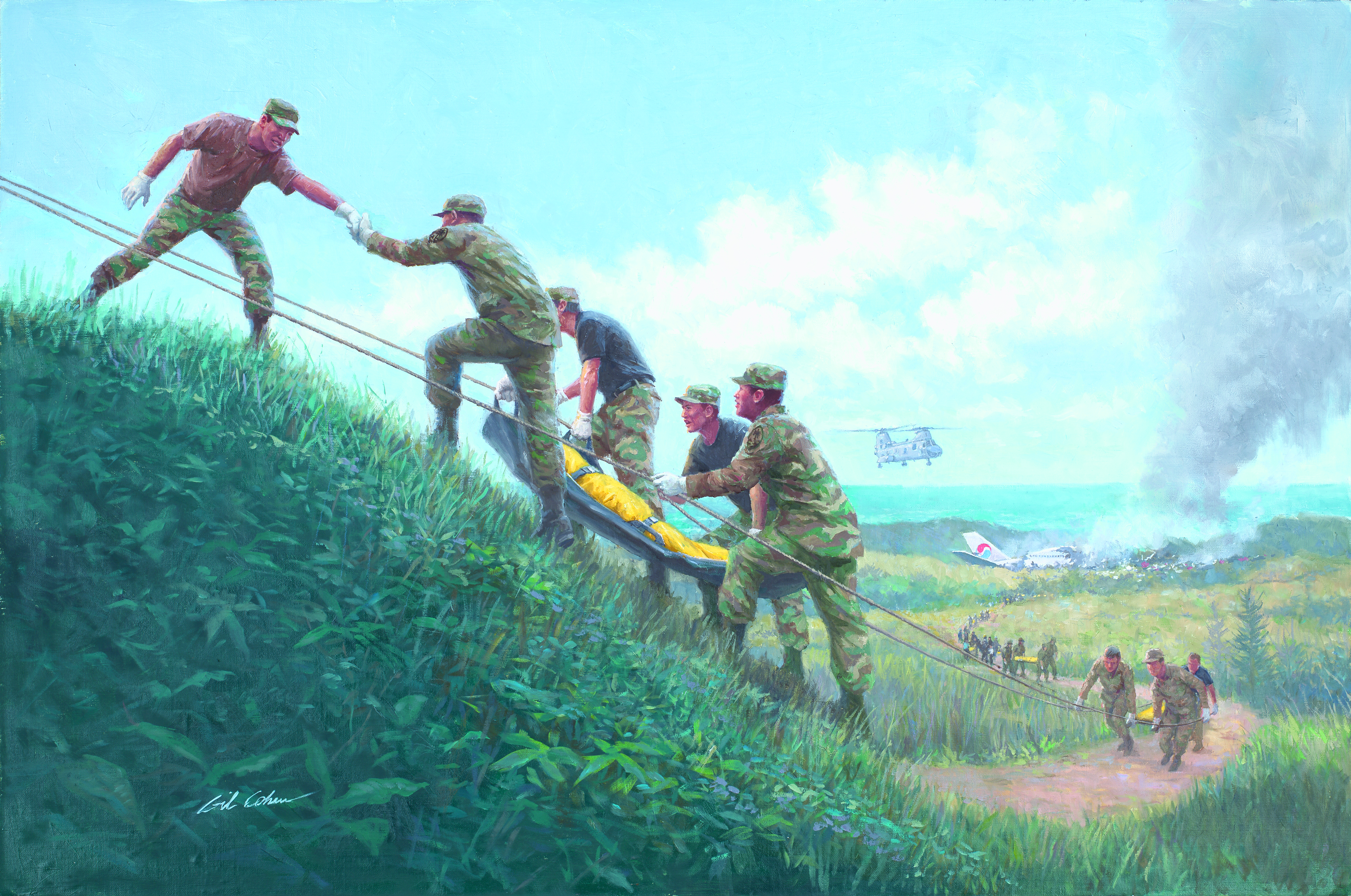 The island’s remoteness from other U.S. territories made it inevitable that its National Guard would have to respond to a disaster of this size. Governor Carl T.C. Gutierrez called upon nearly 500 National Guard Soldiers and Airmen to support rescue and recovery operations. Operations at the crash site, already difficult due to the steep slope of the hillside and thick sword grass, were further complicated by a ruptured gas line and the large size of the debris field, as KAL 801 had broken up into multiple sections.