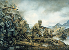 In September 1943 the Allies invaded the southern Italian mainland at Salerno. Strategic planners had believed that the Germans would then withdraw north, toward the Alps. But the Germans did not withdraw, and in what became known as the Battle of the Winter Line, the Allies began their long fight up the Italian peninsula. Iowa's 168th Infantry landed at Salerno some three weeks after the initial invasion. Part of the 34th Infantry Division (Red Bull) from Iowa, Minnesota, and South Dakota, and the first U.S. Army division to arrive in Europe, the 168th Infantry was already a veteran of the North African campaigns. In Italy, the regiment went into action almost immediately, and on November 28, 1943, the 1st Battalion was directed to seize Mount Pantano, a large mountain whose four knobs gave it a square shape. Situated in a draw between the four knobs, was a full battalion of German defenders. Taking the first knob from the surprised Germans, Company A repulsed an almost immediate counter attack in hand-to-hand fighting. The rest of the battalion arrived and for the next five days the men were under constant attack. Company A's commander, although wounded three times, led a bayonet charge against a German breakthrough; Company B stopped seven German assault waves; grenade duels raged all around the perimeter. When their ammunition was exhausted, the Americans hurled rocks and C-ration cans at the Germans. Because pack mules could only travel one-third of the way up the steep and rain-soaked slopes, supply was a critical problem. For two days there was nothing to drink but rainwater. To evacuate a casualty meant four to six hours on foot down the steep trail, under mortar fire, which forced the battalion surgeon to treat casualties on the actual firing line. Despite the constant attacks, severe casualties, cold weather and lack of ammunition and food, the 1st Battalion, 168th Infantry held its position for five days until it was relieved. For its gallantry, the unit was awarded the Presidential Unit Citation. This was not the last Italian hillside the 168th and its sister regiments would take from the Germans: the 34th Infantry Division spent the rest of the war in Italy, and is credited with more actual days in combat than any other U.S. Army division. Today, the heritage of the "Red Bull" Division is perpetuated by the 34th Brigade, 47th Infantry Division, Iowa Army National Guard.