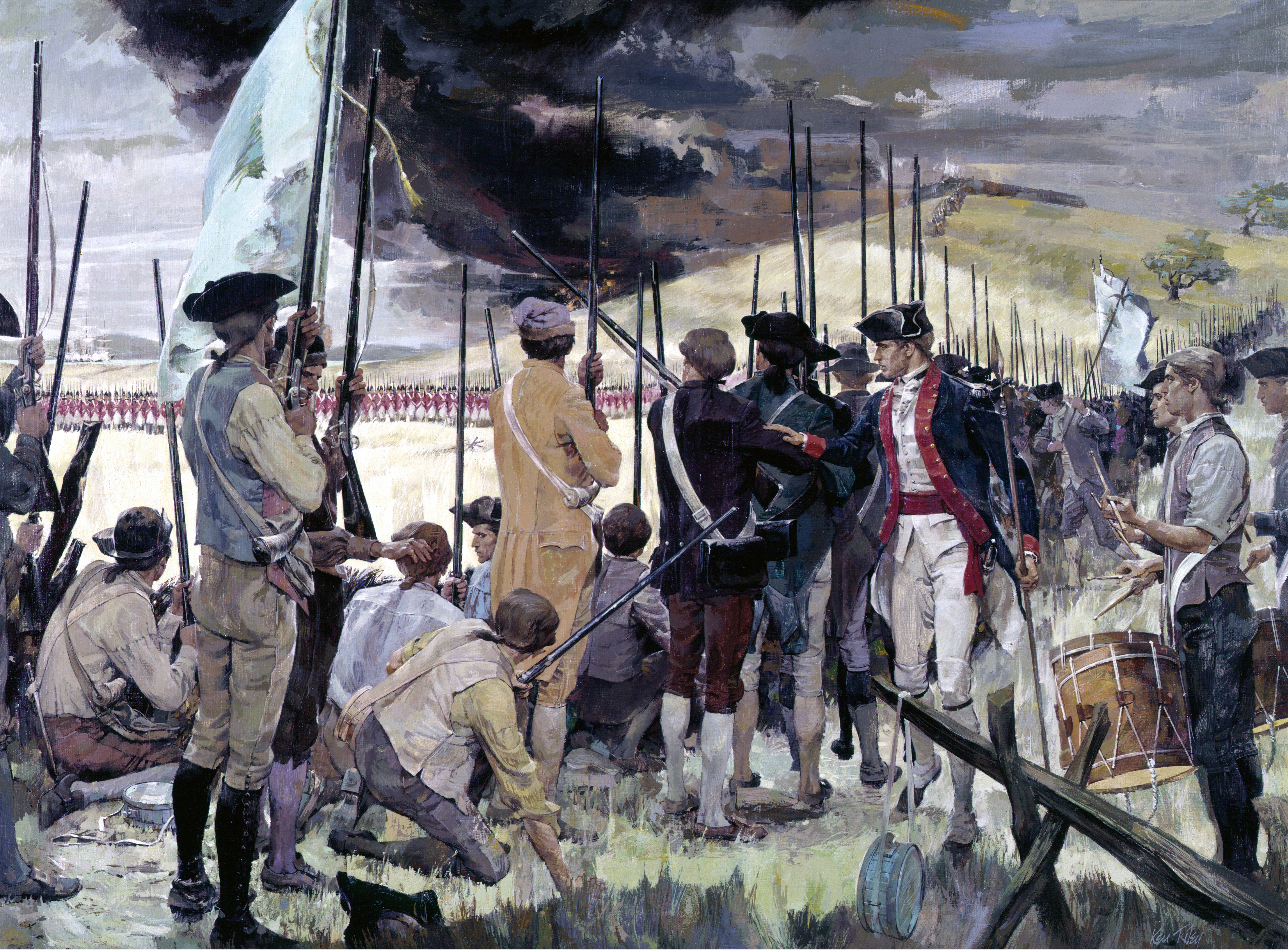 Along the battle line on Breed's Hill and extending to the Mystic River (destined to go into history books as "The Battle of Bunker Hill"), the colonial militiamen coolly held their fire as seven crack regiments of the British Army, the best infantry in the world, advanced toward them. Up from the Charlestown landings came the red-coated enemy, anticipating an easy victory. An officer sternly admonished the militiamen, "Do not fire until you see the whites of their eyes!" With magnificent discipline and courage, they waited . . . fired . . . and thus began the War for Independence. The American militia proved to the world that civilian volunteers could be molded into trained fighting men, thus forging the high tradition of the National Guard in our armed forces.
