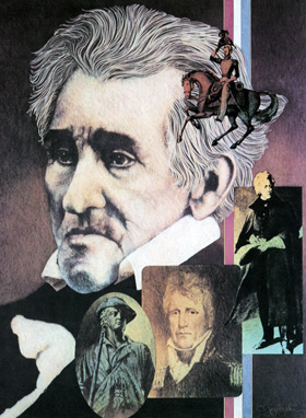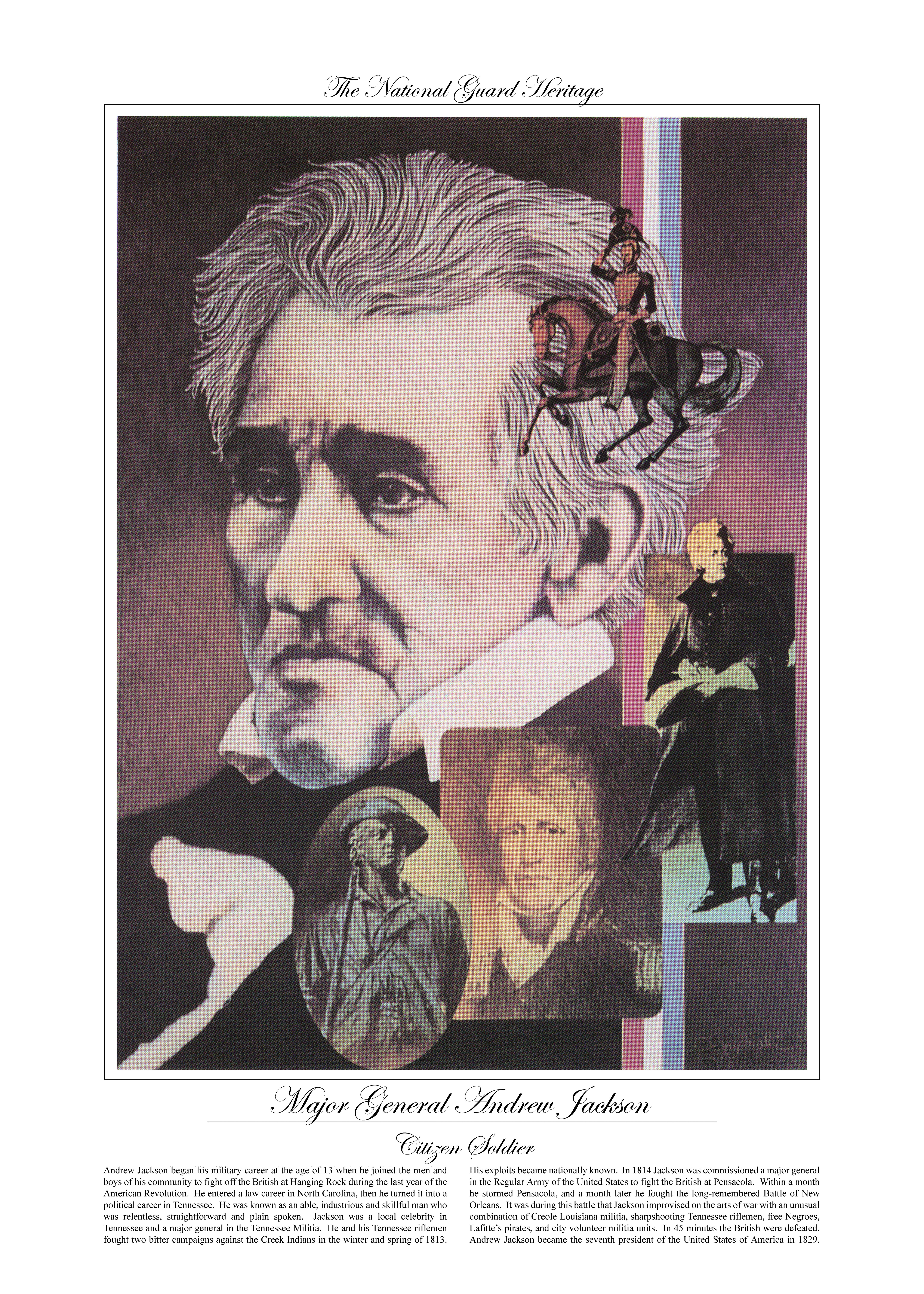 Andrew Jackson began his military career at the age of 13 when he joined the men and boys of his community to fight off the British at Hanging Rock during the last year of the American Revolution. He entered a law career in North Carolina; then turned it into a political career in Tennessee. He was known as an able, industrious and skillful man who was relentless, straight-forward and plain-spoken. Jackson was a local celebrity in Tennessee and a major general in the Tennessee Militia. He and his Tennessee riflemen fought two bitter campaigns against the Creek Indians in the winter and spring of 1813. His exploits became nationally known. In 1814 Jackson was commissioned a major general in the Regular Army of the United States to fight the British at Pensacola. Within a month, he stormed Pensacola, and a month later, he fought the long-remembered Battle of New Orleans. During this battle, Jackson improvised on the arts of war with an unusual combination of Creole Louisiana militia, sharpshooting Tennessee riflemen, free Negroes, Lafitte's pirates, and city volunteer militia units. In 45 minutes, the British were defeated. Andrew Jackson became the seventh president of the United States of America in 1829.