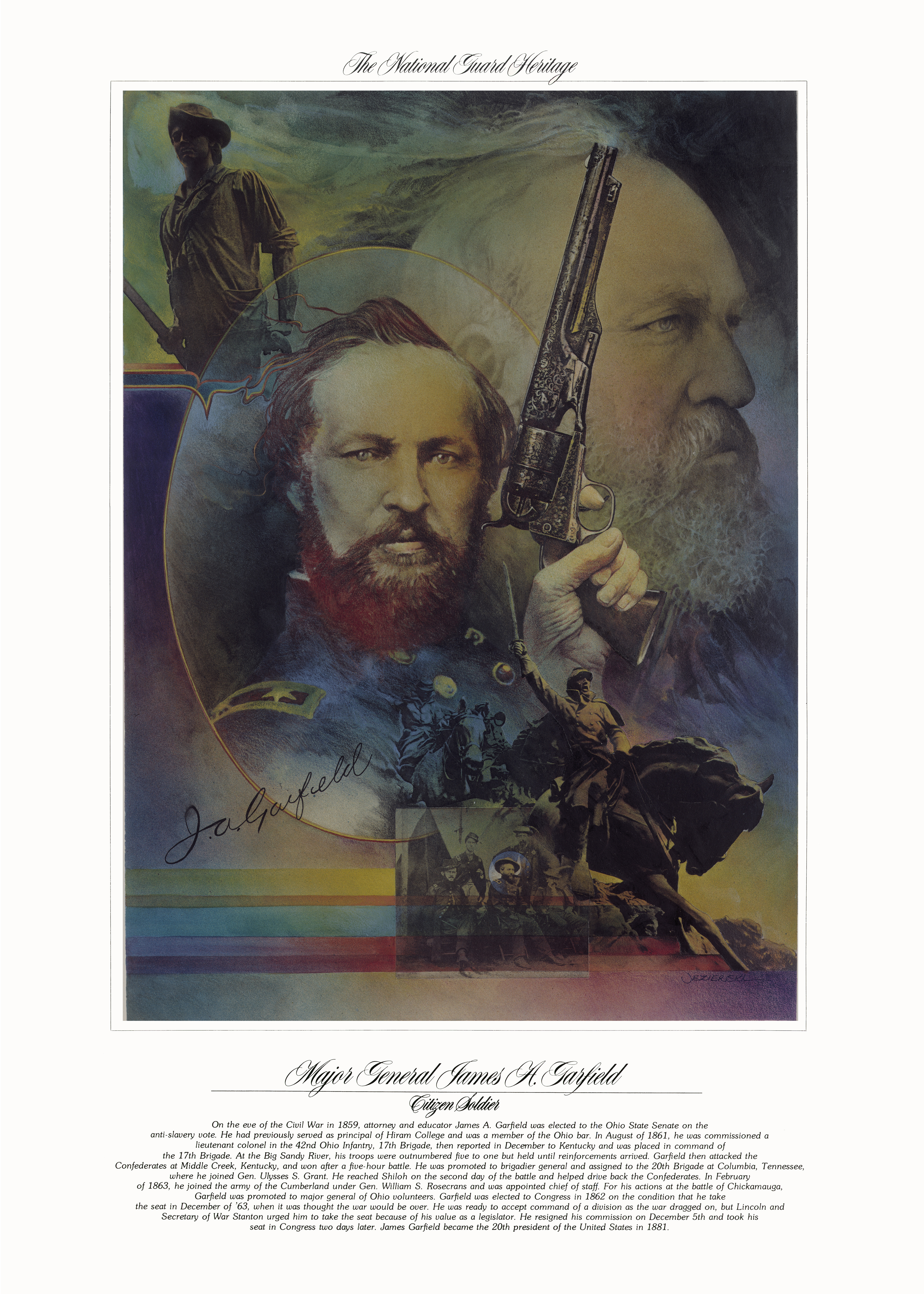 On the eve of the Civil War in 1859, attorney and educator James A. Garfield was elected to the Ohio State Senate on the anti-slavery vote. He had previously served as principal of Hiram College and was a member of the Ohio bar. In August of 1861, he was commissioned a lieutenant colonel in the 42nd Ohio Infantry, 17th Brigade, then reported in December to Kentucky and was placed in command of the 17th Brigade. At the Big Sandy River, his troops were outnumbered five to one but held until reinforcements arrived. Garfield then attacked the Confederates at Middle Creek, Kentucky, and won after a five-hour battle. He was promoted to brigadier general and assigned to the 20th Brigade at Columbia, Tennessee, where he joined General Ulysses S. Grant. He reached Shiloh on the second day of the battle and helped drive back the Confederates. In February of 1863, he joined the army of Cumberland under General William S. Rosecrans and was appointed chief to staff. For his actions at the battle of Chickamauga, Garfield was promoted to major general of Ohio Volunteers. Garfield was elected to Congress in 1862 on the condition that he take the seat in December of '63 when it was thought the war would be over. He was ready to accept command of a division as the war dragged on, but Lincoln and Secretary of War Stanton urged him to take the seat because of his value as a legislator. He resigned his commission on December 5th and took his seat in Congress two days later. James Garfield became the 20th president of the United States in 1881.