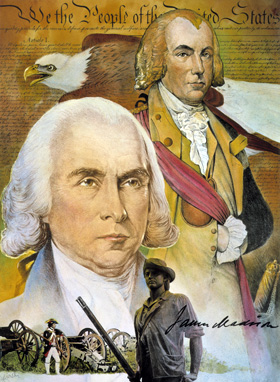 In 1775, after serving briefly as a private, James Madison was commissioned as colonel and commander of the Orange County Regiment, Virginia Militia. Colonel Madison was responsible for the training and readiness of his regiment. Although frail health precluded active service, Madison gained prominence as a patriot and statesman. In 1776 he was elected to the Virginia Constitution Convention, where he helped to frame a constitution and bill of rights. Madison was elected to the Continental Congress in 1780. In 1781, Colonel Madison was appointed county lieutenant of Orange County, Virginia, and was responsible for all militia affairs in the county, including supervising the training of the militia. While serving in the Virginia legislature, he led the effort to convene a national constitutional convention that met in the summer of 1787. If not the father of the Constitution, Madison was certainly its prime architect. His Virginia Plan called for a national government with three branches that would be supreme over the states. Madison also played a critical role in convincing the states to ratify the Constitution. After serving as a congressman and Secretary of State, James Madison was inaugurated as the fourth president of the United States in March 1809.
