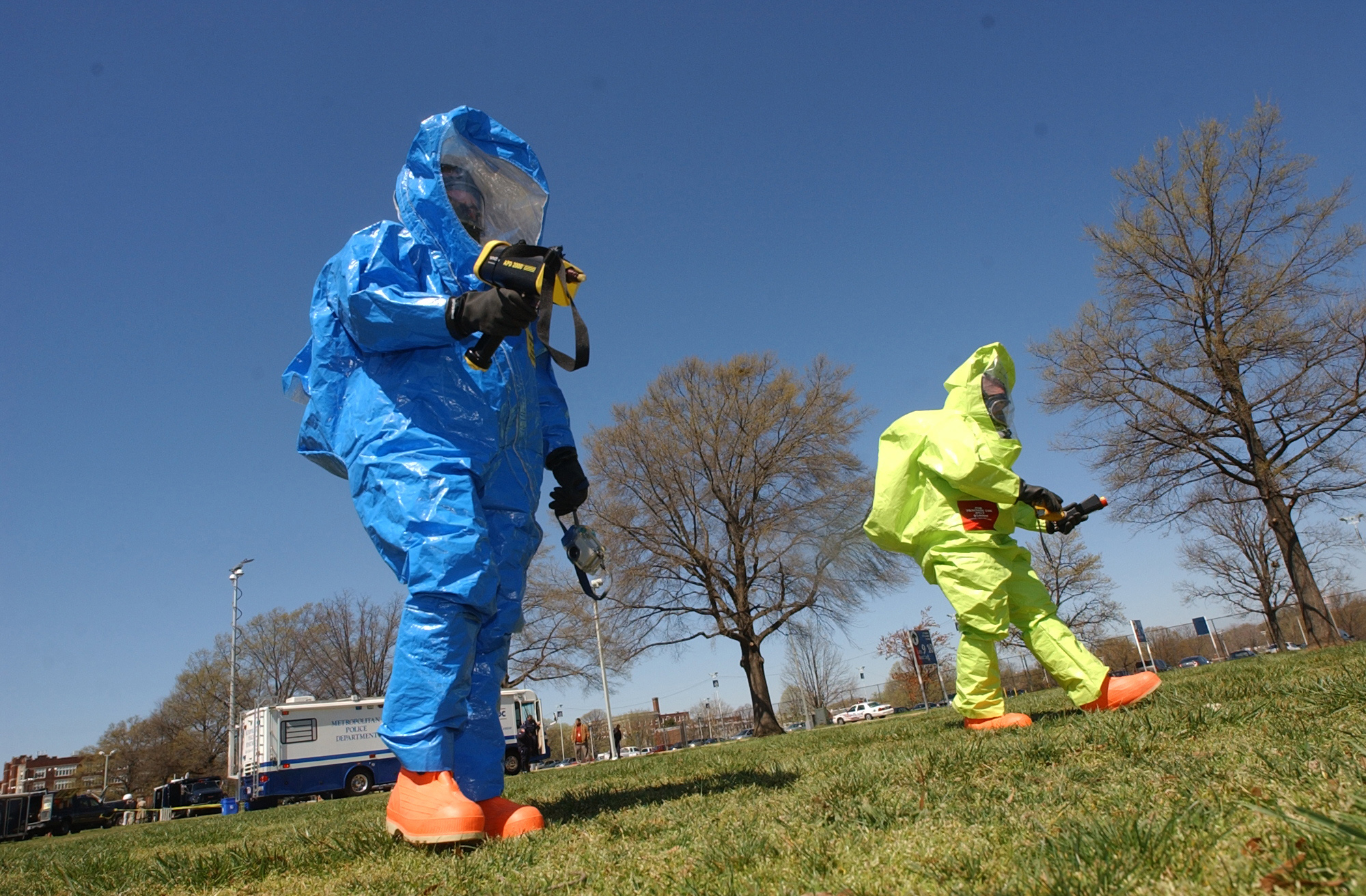 Soldiers assigned to a Chemical, Biological, Radiological, Nuclear Explosive Enhanced Response Force Package search for survivors during a simulated attack at the District of Columbia National Guard Armory, Monday, April 03, 2006. The training was part of a demonstration of National Guard capabilities. (U.S. Army Photo by Staff Sgt. Jon Soucy/ 29th MPAD).