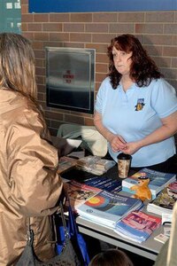 Indianapolis, IN - Connie S. Douthat, Family Programs coordinator for the 122nd Fighter Wing of the Indiana Air National Guard, discusses support programs available to military personnel at a welcome home celebration held at Lucas Oil Stadium in Indianapolis, Ind., Jan. 31, 2010.