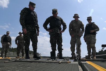 CLARKS HILL TRAINING SITE, S.C. - U.S. Army Pfc. Micah Grover, a bridge crewmember with the 125th Multi-role Bridge Company, South Carolina Army National Guard, locks together two floating bridge sections as Lt. Col. Jorge Flechas, left, and Maj. Jhon Chaparro, both with the Colombian army’s engineer command, and U.S. Army Capt. Meredith Hohe, commander of the 125th MRBC, look on during a training mission at Clarks Hill Training Site, S.C., July 17, 2024.