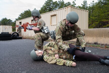 JOINT BASE CAPE COD, Mass. - U.S. Air Force Staff Sgt. Austin Anacki, a member of the 102nd Medical Group, applies a tournaquet onto a live role player during a Tactical Casualty Combat Care (TCCC) training exercise on Camp Edwards, Joint Base Cape Cod, Massachusetts, April 4, 2025. During the “Care Under Fire” phase of the TCCC Tier II training, Airmen underwent a simulated combat situation and were expected to respond to a wounded member while under enemy fire, focusing on quickly removing the casualty from immediate danger. (Air National Guard photo by Senior Airman Julia Ahaesy)